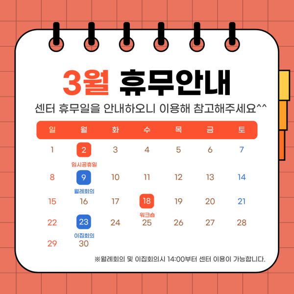[2026년 3월] 서울근로자건강센터 이용 제한 안내페이지정보 작성자 관리자 날짜26-02-23 14:14 조회수14 댓글0목록본문 안녕하세요. 3월 서울근로자건강센터, 서울직업트라우마센터, 중구분소 센터 휴무일을 안내합니다. 이용에 참고하시기 바랍니다^^ 문의: 서울근로자건강센터 서울직업트라우마센터 (02-838-6497) 서울근로자건강센터 중구분소(02-2268-6497) 댓글목록등록된 댓글이 없습니다.목록