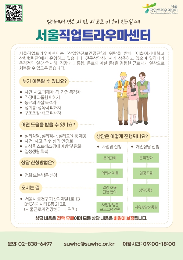 전화 02-838-6497, 070-7776-9947 ('직업트라우마상담을 받고 싶습니다'라고 말씀해주세요)