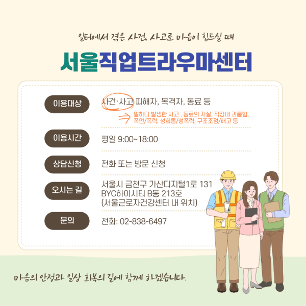 일터에서 생긴 큰 일로 마음의 충격이 크신 분들은 언제라도 서울직업트라우마센터의 심리지원을 받을 수 있습니다.