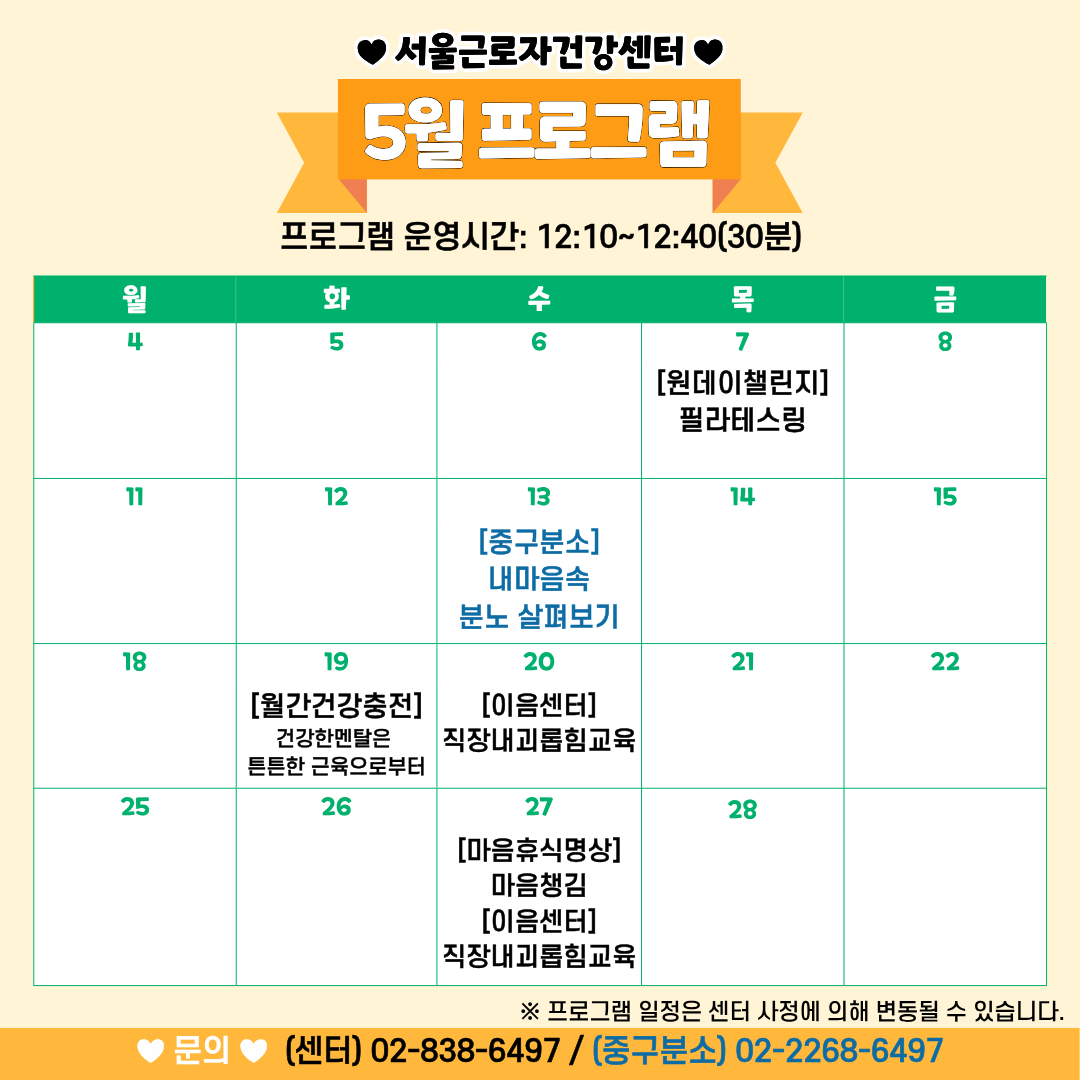 공지사항센터 소식프로그램 신청 안내건강정보 자료실자주 묻는 질문프로그램 신청안내프로그램안내 2026년 [센터][분소] 5월 프로그램 안내페이지정보 작성자 관리자 날짜26-04-27 10:20 조회수13 댓글0다음목록본문 5월 센터, 중구분소 프로그램을 안내해드립니다. 이용에 참고해주세요~! 댓글목록등록된 댓글이 없습니다.다음목록