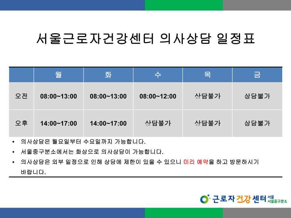 소규모 사업장의 근로자들은 상대적으로 열악한 환경에서 일하며, 시간이나 비용 측면에서 적절한 건강관리를 받지 못하는 경우가 많습니다. 서울근로자건강센터에서는 이러한 취약계층 근로자의 건강을 위하여 직업환경의학과 전문의 건강상담 서비스를 제공하고 있습니다.